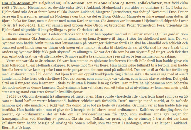 …..Så langt Jone Eiane. For å gjøre en lang historie kort, så hadde Endre gjort dette på spøk, mens Øystein mente alvor. Han sa til Endre at den som gjør andre til narr, selv skal gjøres til narr til slutt. Endre allierte seg med presten og de satte harde vilkår for Øystein. Pengene måtte skaffes til en bestemt dato, men Øystein fikk ikke låne av noen i Hjelmeland. Han måtte til Bergeland på Ombo. Etter en slitsomt reise dit, fikk han låne det han trengte av Johannes Ormson Bergeland (kalt Osmund), og pengene lå på bordet i Viga til rett tid. Dermed var gården hans. Det finnes dokumenter for at dette lånet virkelig ble tatt opp – på beløpet 550 rdlr. (Fritt etter T. Brandal: «Hjelmeland. Gardar og folk 2»).