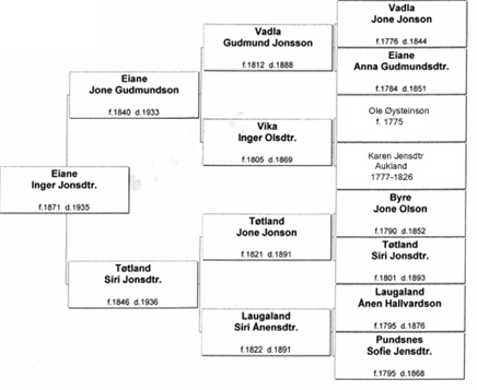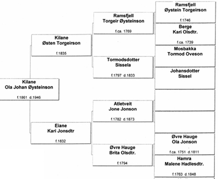 Vi vil her følge Kilane/Eiane-slektene bakover i tid. Ørnulf Pedersen har gjort slektgransking av sin mormor Anna Kilanes slekt. Anna var søster av bl.a. Torger, Sigurd, Magnus og Jone. Ørnulf Pedersen er sønn av Ingrid Pedersen f. Skår. Ved hjelp av Ørnulf Pedersens arbeid kan vi følge Kilane-slekten langt tilbake. De følgende oversikter er stort sett fra hans arbeid. Jeg har imidlertid gjort noen tilføyelser, lagt inn bilder og tekst basert på annen slektsforskning fra Ryfylke som ligger på nettet, først og fremst bygdebøker, men også www.helgeland.nu/Slekt/Slekta.htm, http://home.lyse.net/janarild/ og http://home.online.no/~harahaav/
