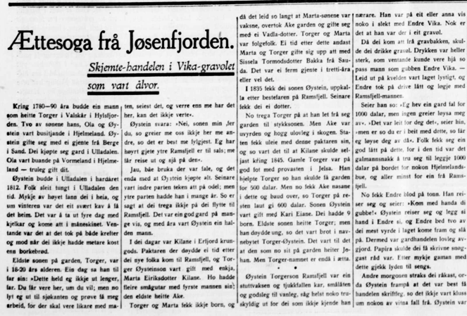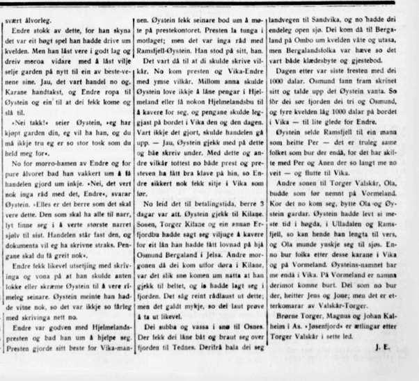 …..Han forteller etter manns minne, og det kan hende at noe er pynta på eller fordreid. Vi vet f.eks. ikke hvilket gravøl det dreier seg om i 1798; ingen døde nemlig der på gården i dette tidspunktet. Men det fortelles atdet i gravølet var lystig lag, og Endre Viga begynte å spøke med Øystein Ramsfjell. Han sier: Eg hev ein gard fal for 1000 dalar, men ingen greier å løysa meg av.» «Det var leitt for deg», sier den andre, «men er du so i beit med dette, får eg løysa deg av då.» Folk fikk seg en god latter av dette, for på den tida var det galmannsverk å betale 1000 daler for en Hjelmelandsgård, og aller mest for en fra Ramsfjell.